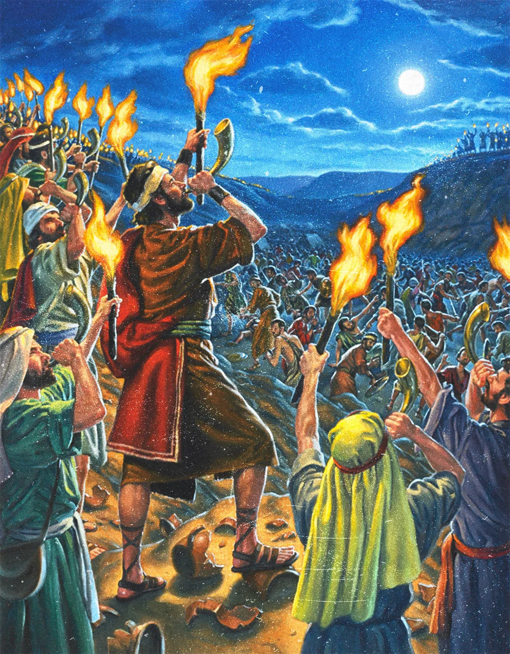 Gideon continued to listen to the voice of the Lord and divided the men into three camps. He placed trumpets and empty jars in each of the soldier’s hands with torches inside. On Gideon’s command they blew their trumpets and broke the jars, shouting, “For the Lord and for Gideon!” When they did this, God caused confusion to come into the Midianite camp and the Midianites began to turn on one another with their swords while the Israelites stood their ground.
